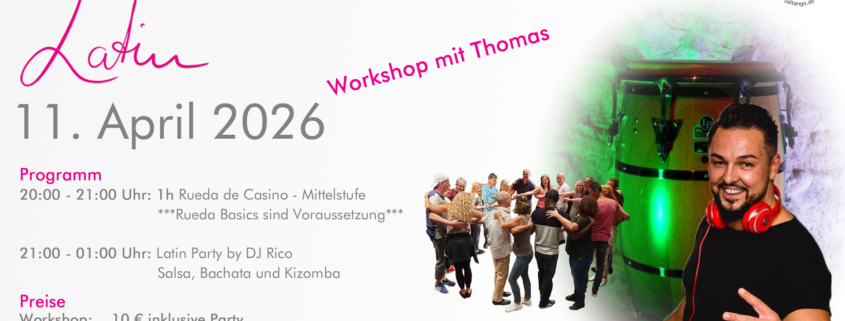 Am 7. März findet unsere nächste Salsaparty statt mit gewohnt toller Musik von DJ Rico. Im Vorfeld der Party gibt es einen Rueda de Casino Workshop mit Thomas. ACHTUNG! Es ist Mittelstufe. Gute Rueda Basics sind Voraussetzung.